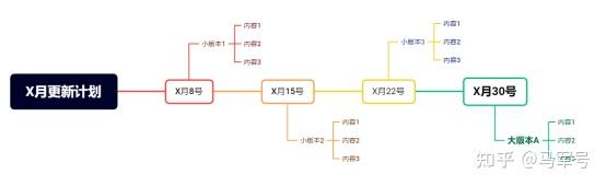 在版本计划中要把这几块的内容体现出来,先以一个时间线的形式拉出时间轴,标出几个版本的更新时间点。